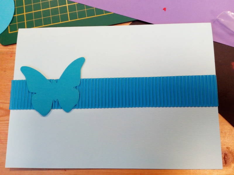 Als kaartje kan je de op de voorkant van je een stuk golfkarton opkleven en daarop ook nog andere tekeningen of knopjes of strikjes op kleven.